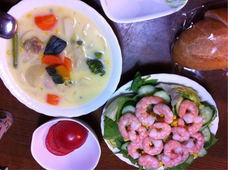 シチューにかぼちゃ、ブロッコリー、アスパラもいれました。
