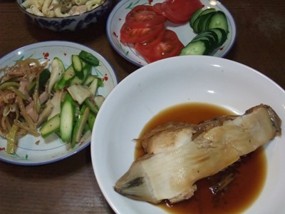 最近手を抜いていますな。煮魚、野菜、サラダ。