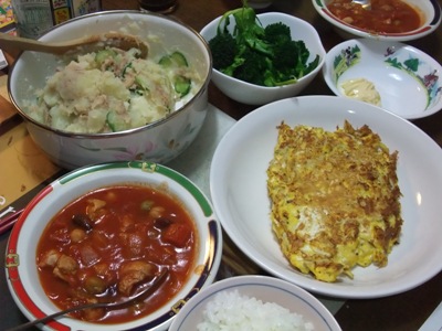 チキンビーンズ(残り物の鳥肉)、じゃがいもサラダ(残り物のキュウリ)、