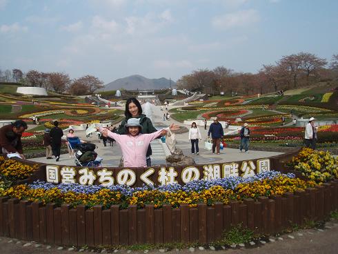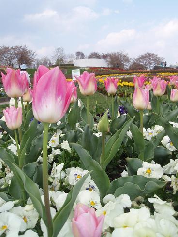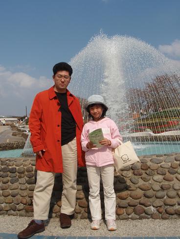 噴水も気持ちよさそう。かいけパパ眠そう。(左)「ダイナスティ」可憐なチューリップ。(右)