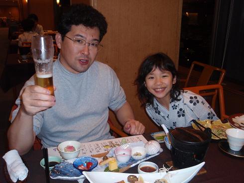 プールで泳ぎ、温泉に入り、夕飯を食べ終わったところでやっとかいけパパ登場。