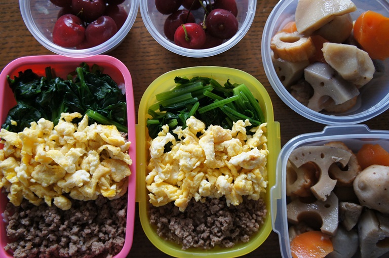 定番三食ごはん。緑はほうれん草で。