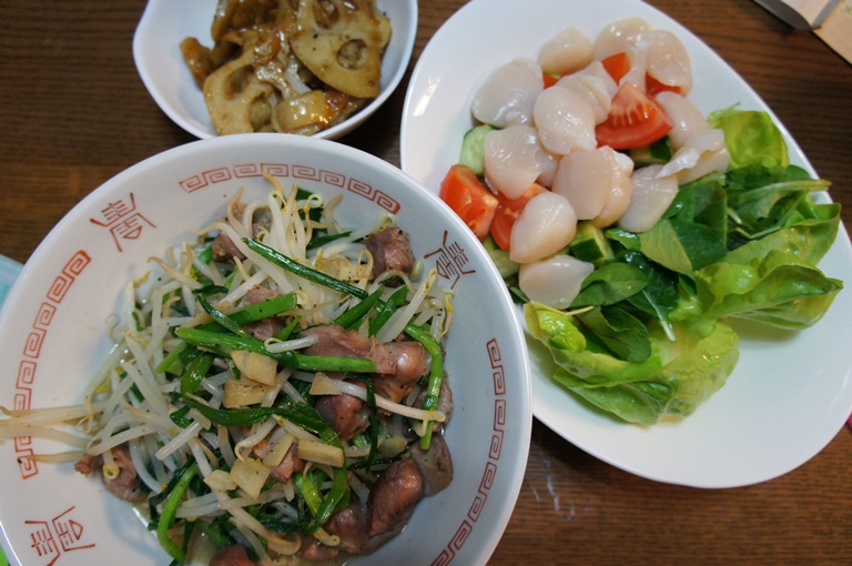 水菜はシラスと和えて、エビは青梗菜と炒めました。