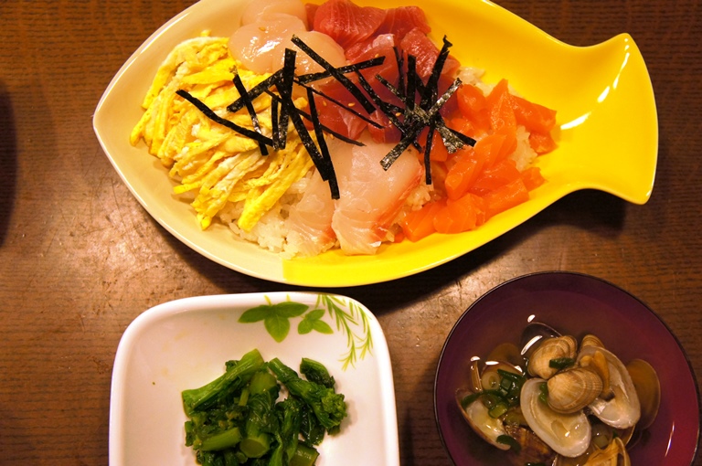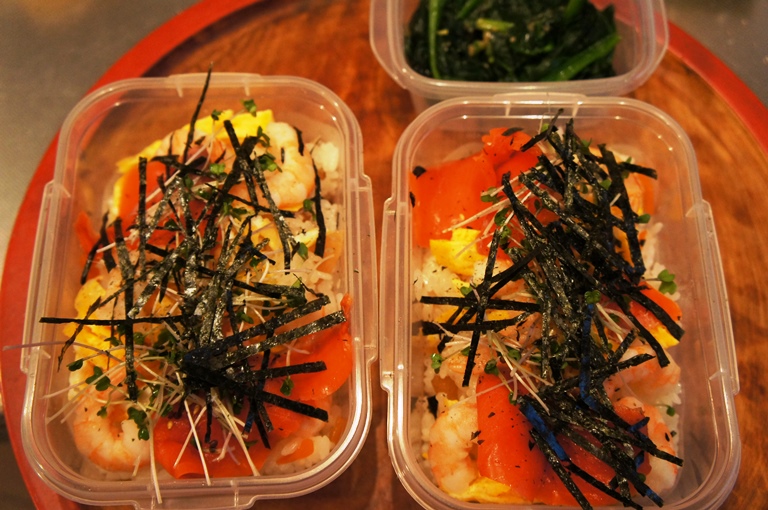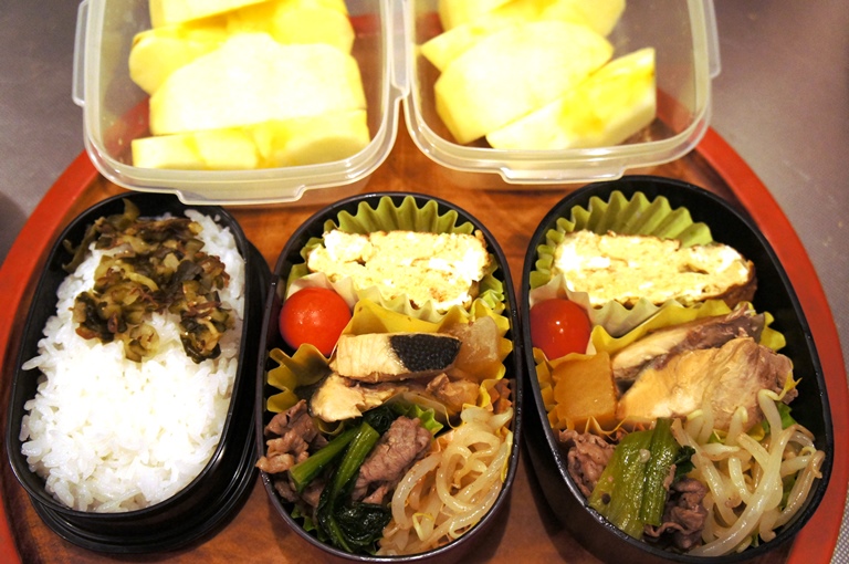 牛肉と小松菜の炒めたの。もやしのナムル。