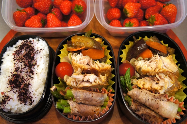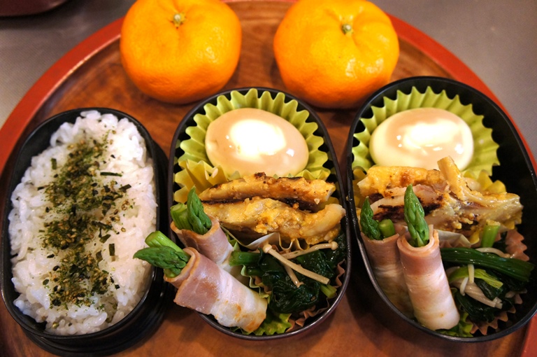 アスパラベーコン。お浸しはエノキとほうれん草。