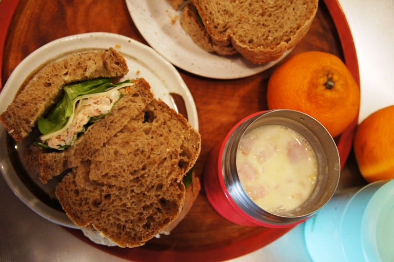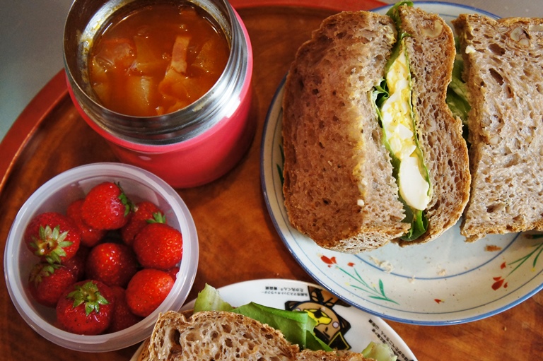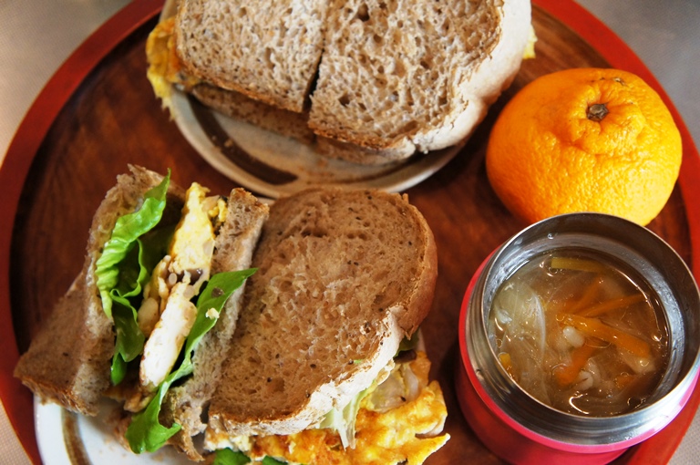 ライ麦パンを焼いて、ベーコンエッグを挟みました。