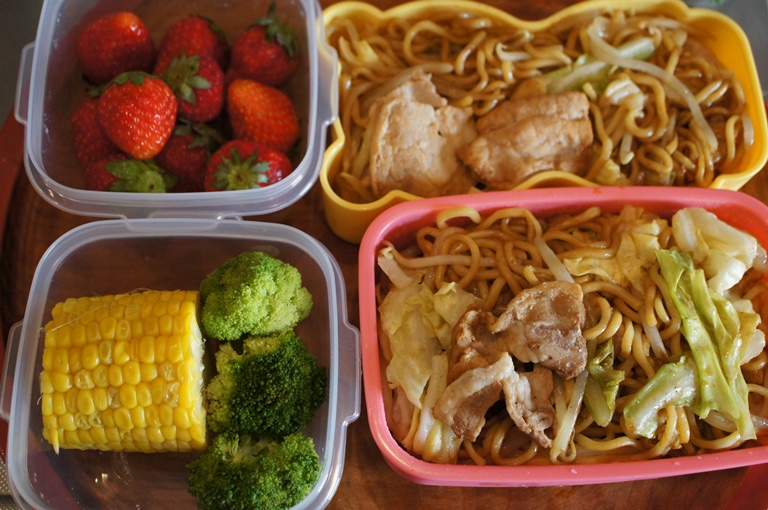 焼きそば、蒸しトウモロコシ。ブロッコリー。