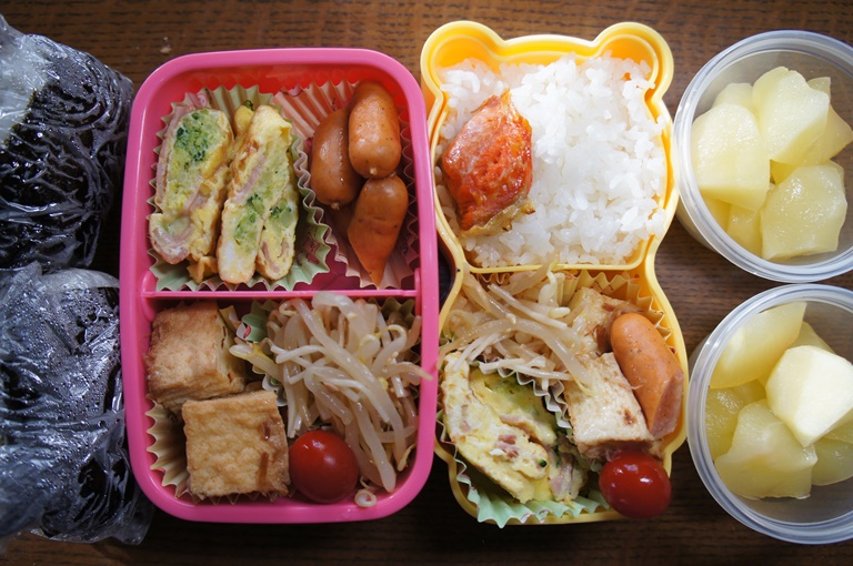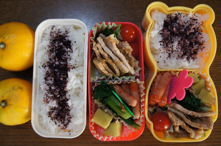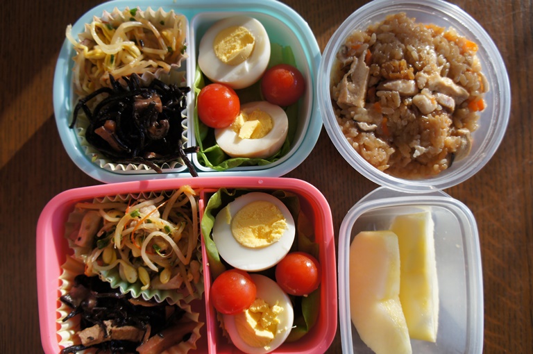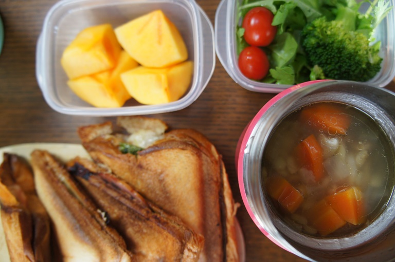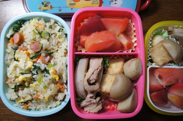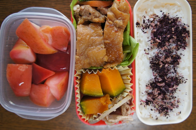 かぼちゃの煮物、鶏肉のはちみつ焼の下には野菜炒め。