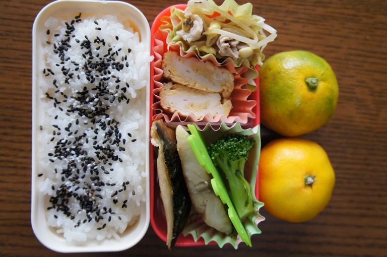 豚肉と豆もやし炒め。ミカンは和歌山産。