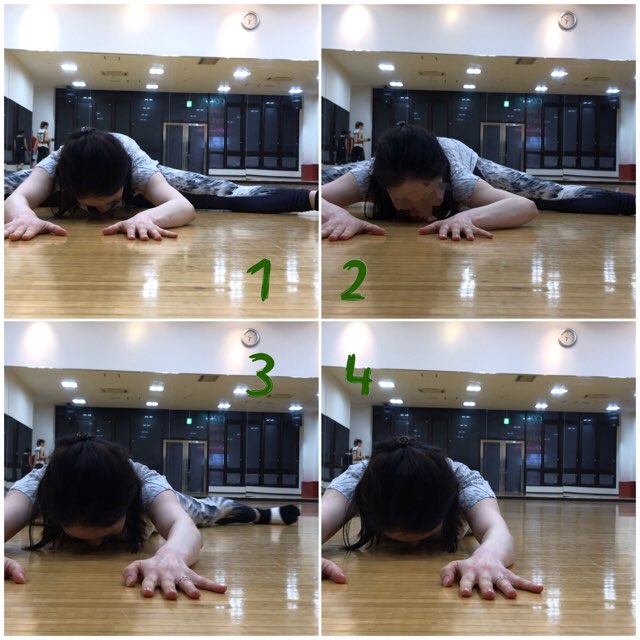次は開脚前屈のまま脊柱の伸展屈曲。上の方、下の方。
